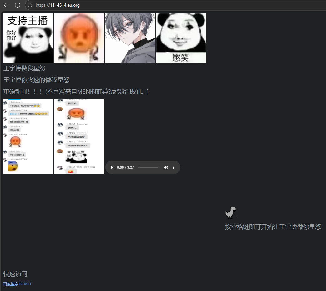 2023-08-03 , 收集了 周佳希,王宇博,Gouzaya 之间的聊天截图,并编写了网站 王宇博火树变星怒游戏 并在GithubPage上部署[2]。
